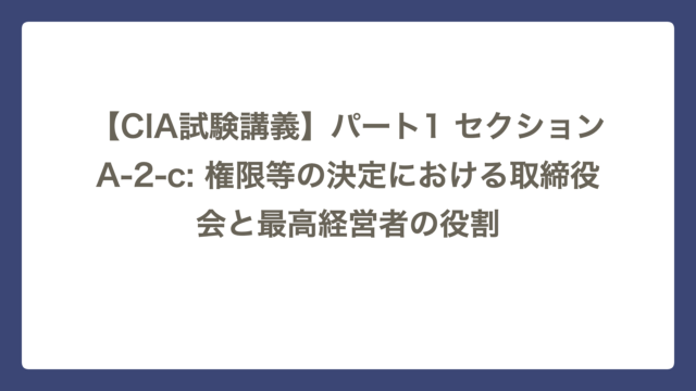 セクションA 【CIA試験講義】パート1 セクションA-2-c: 権限等の決定における取締役会と最高経営者の役割 CIA Lab テーマ:誰が「許可証」を発行するのか? ~ガバナンスとマネジメントの役割分担~ 内部監査部門が強力な権限(アクセス権など)を持つため …