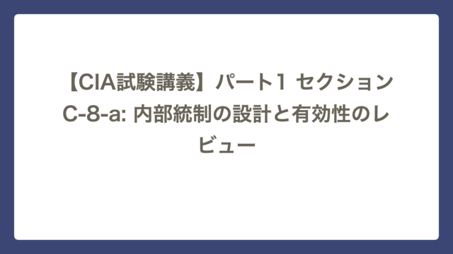 セクションC 【CIA試験講義】パート1 セクションC-8-b: 内部統制フレームワークの目的と便益 CIA Lab テーマ:組織の「骨格」を作る ~なぜ我流ではいけないのか?~ セクションC-8-bは、COSO(トレッドウェイ委員会支援組織委員会) …