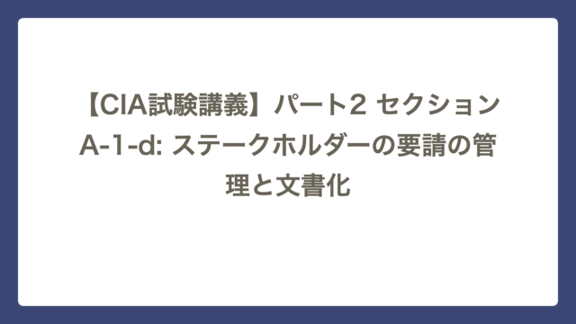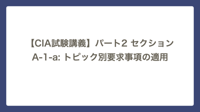 セクションA 【CIA試験講義】パート2 セクションA-1-a: トピック別要求事項の適用 CIA Lab テーマ:一般道と「専用レーン」の走り方 ~トピック別要求事項の位置づけ~ セクションA-1-aは、2024年に公表されたGIAS(グ …