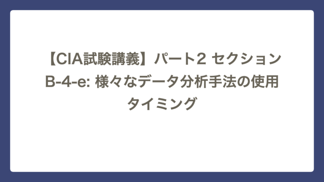 セクションB 【CIA試験講義】パート2 セクションB-4-e: 様々なデータ分析手法の使用タイミング CIA Lab テーマ:「過去」の解明から「未来」の提言へ ~4つの分析レベルと使い分け~ セクションB-4-eは、単に計算ソフトが使えるかどうかで …
