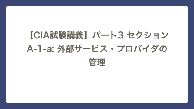 セクションA 【CIA試験講義】パート3 セクションA-1-a: 外部サービス・プロバイダの管理 CIA Lab テーマ:助っ人を使いこなす監督の流儀 ~アウトソーシングとコソーシング~ 内部監査部門ですべての専門知識(AI、サイバーセキュリティ …