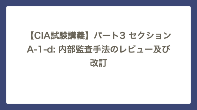 セクションA 【CIA試験講義】パート3 セクションA-1-b: 内部監査業務のモニタリング手法 CIA Lab テーマ:監査人の健康診断 ~QAIPとパフォーマンス指標~ セクションA-1-bは、個々の監査業務(パート2の内容)が積み重なって、 …