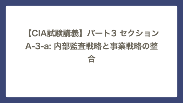 セクションA 【CIA試験講義】パート3 セクションA-3-a: 内部監査戦略と事業戦略の整合 CIA Lab テーマ:羅針盤を合わせる ~組織と同じ方向を向く監査~ セクションA-3-aは、CAE(内部監査部門長)が、内部監査部門の戦略を策定 …