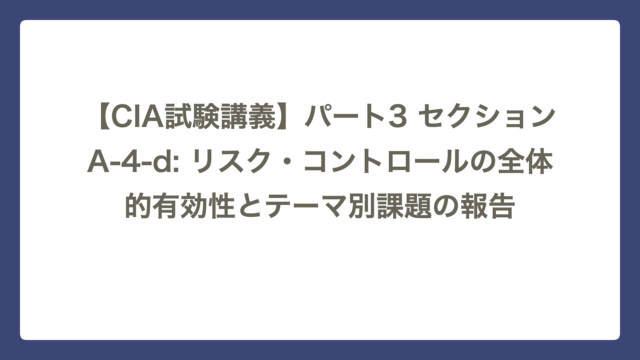 セクションA 【CIA試験講義】パート3 セクションA-4-d: リスク・コントロールの全体的有効性とテーマ別課題の報告 CIA Lab テーマ:「木」ではなく「森」を見る力 ~点と点を線にする報告~ セクションA-4-dは、個々の監査報告書(個別の木)を積み上げるだけ …