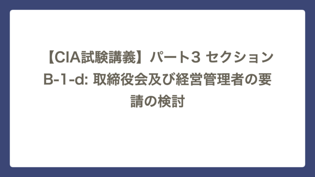 セクションB 【CIA試験講義】パート3 セクションB-1-g: 監査周期(頻度)の決定とその理由 CIA Lab テーマ:「定期検診」か「緊急手術」か ~リスクに応じたタイミングの決定~ セクションB-1-gは、特定された監査対象(ユニバースの構 …