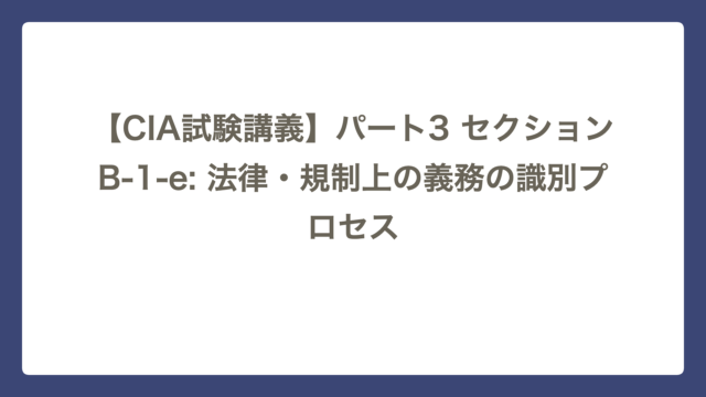 セクションB 【CIA試験講義】パート3 セクションB-1-e: 法律・規制上の義務の識別プロセス CIA Lab テーマ:見えない「地雷」を地図に落とし込む ~コンプライアンス・ユニバースの構築~ セクションB-1-eは、監査計画を策定する際、組 …