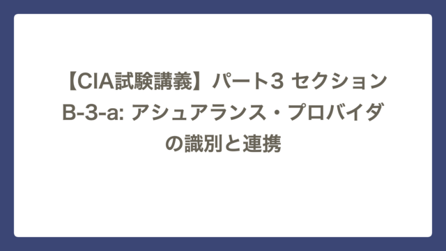 セクションB 【CIA試験講義】パート3 セクションB-3-a: アシュアランス・プロバイダの識別と連携 CIA Lab テーマ:重複を避け、隙間を埋める ~「保証の地図」を描く~ セクションB-3-aは、内部監査部門が組織内の「唯一の監査役」ではないこ …