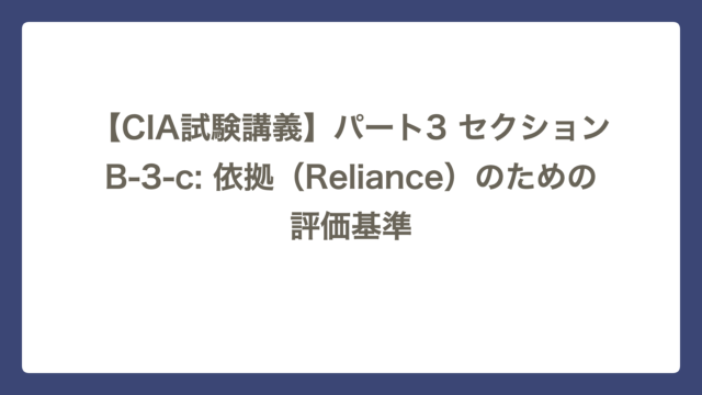 セクションB-3 【CIA試験講義】パート3 セクションB-3-c: 依拠(Reliance)のための評価基準 CIA Lab テーマ:信用調査と品質チェック ~「任せて大丈夫か?」を見極める~ セクションB-3-cは、他のアシュアランス・プロバイダ(第2線や …