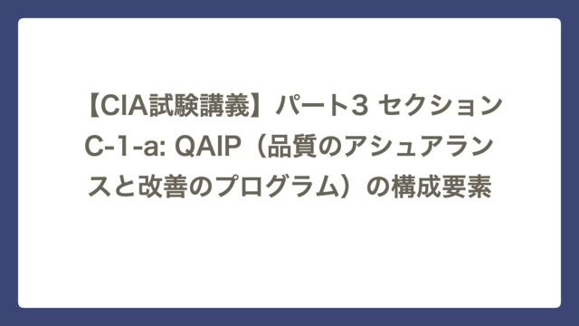 セクションC 【CIA試験講義】パート3 セクションC-1-c: QAIP(品質のアシュアランスと改善のプログラム)の目的 CIA Lab テーマ:「監査人の監査」はなぜ必要か? ~信頼を担保する3つの柱~ セクションC-1-cは、なぜ内部監査部門がわざわざ時間と労力をか …