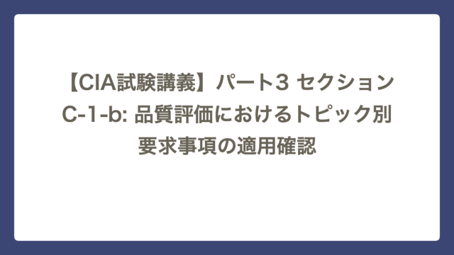 セクションC 【CIA試験講義】パート3 セクションC-1-b: 品質評価におけるトピック別要求事項の適用確認 CIA Lab テーマ:車検の検査項目 ~「特定の車種」だけの必須検査~ セクションC-1-bは、QAIP(品質評価)を実施する際、監査対象となった …