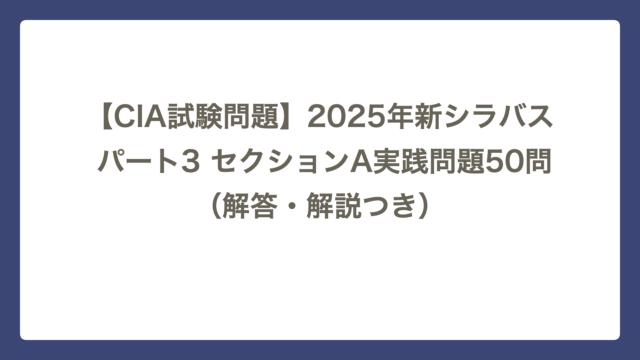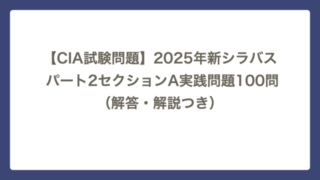 セクションA | 実践問題70問 【CIA試験問題・2025年新シラバス】パート1 セクションA|実践問題70問(解答・解説つき) CIA Lab CIA試験対策問題集:パート1 セクションA(70問) Q1. グローバル内部監査基準によると、内部監査の主な目的は何か。 A …